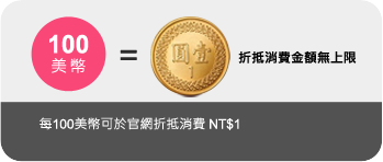 • 每100美幣可折抵 NT$1消費金額