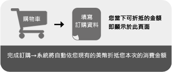 例如:您持有540美幣,購物車會為您扣除500美幣,等於折抵 NT$5,剩下40美幣將存留於您的會員帳戶與未來消費累積的美幣繼續累積。