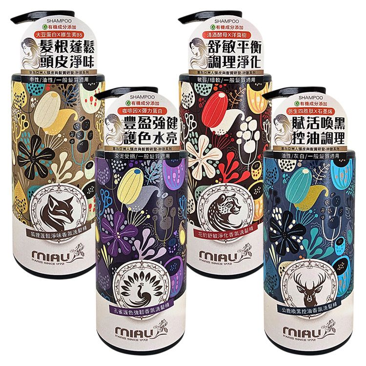 - 狐狸蓬鬆淨味/花豹舒敏淨化/孔雀護色強韌/公鹿喚黑控油